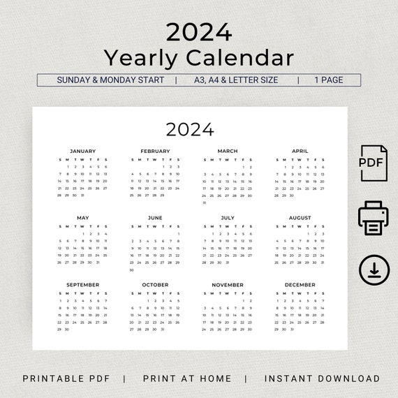 2024 Yearly Calendar Printable Minimalist Calendar 2024 Etsy